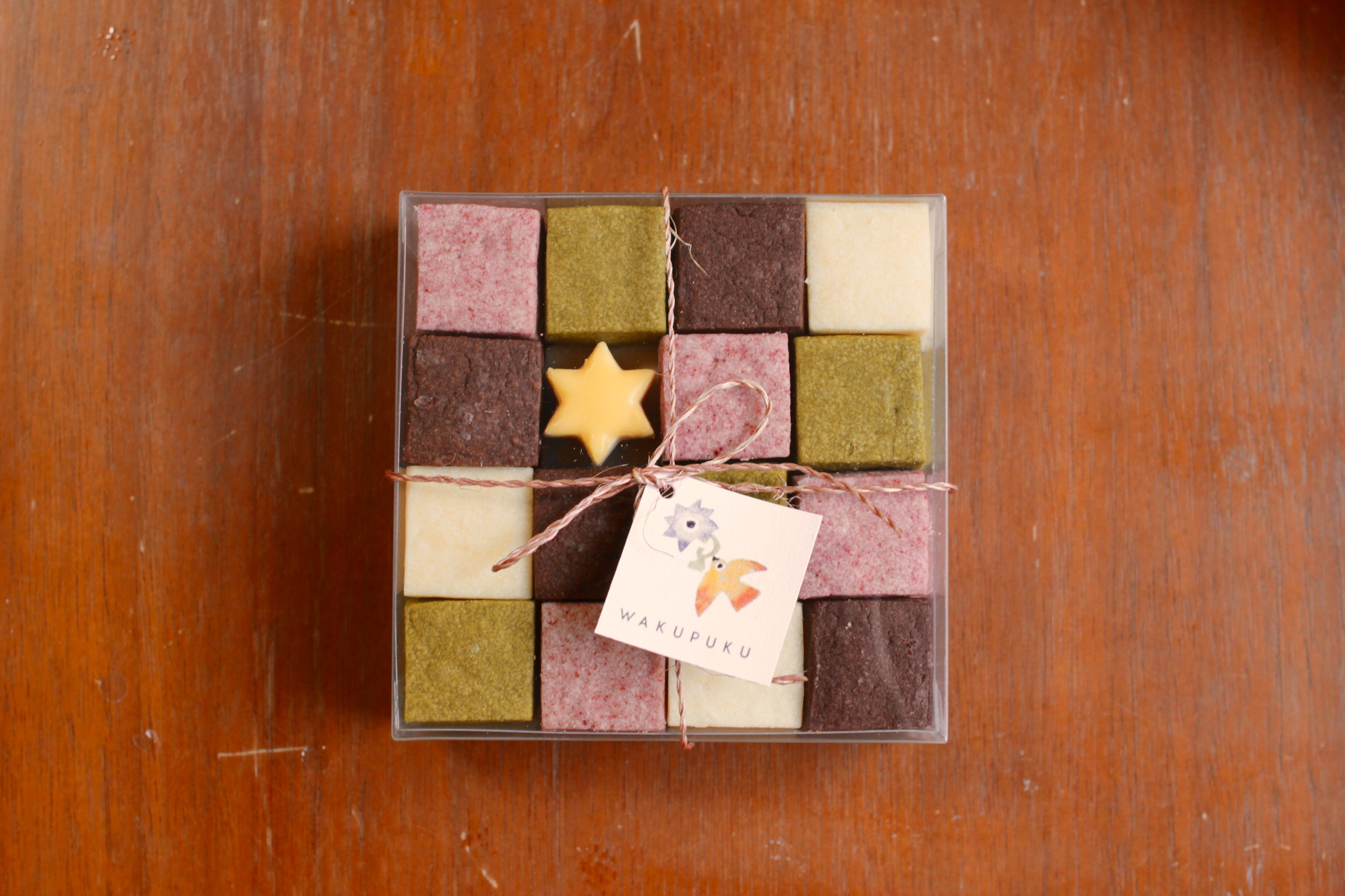小さな正方形のショートブレッドをモザイクタイルのように組み合わせてクリスマス仕様にしました。